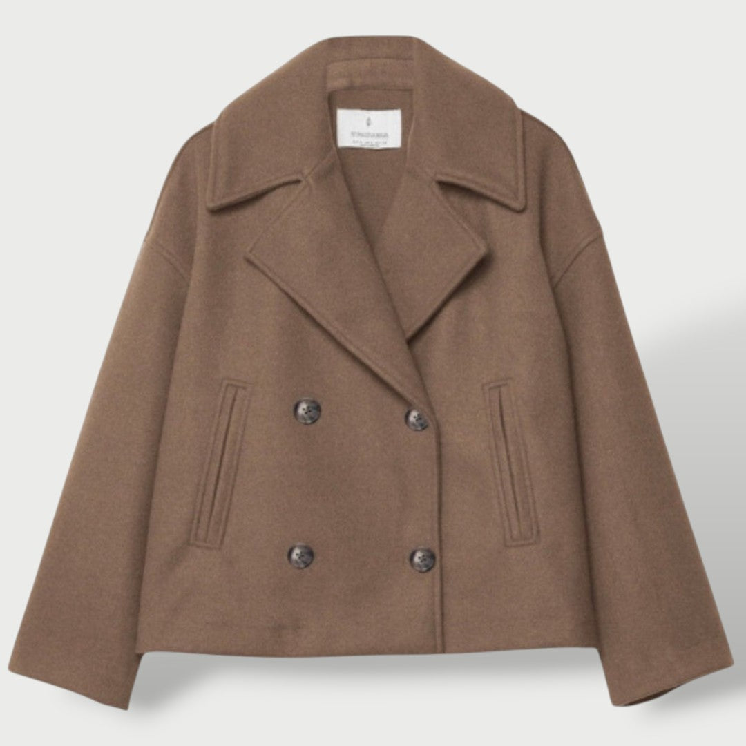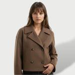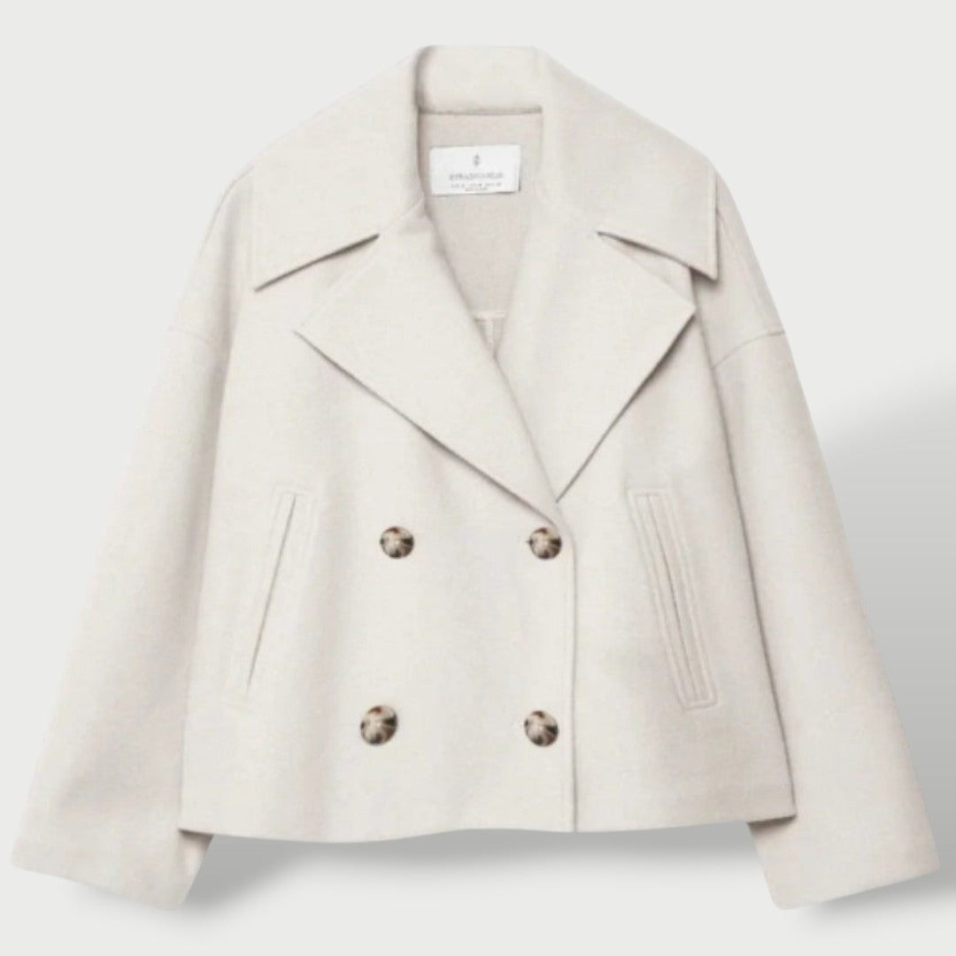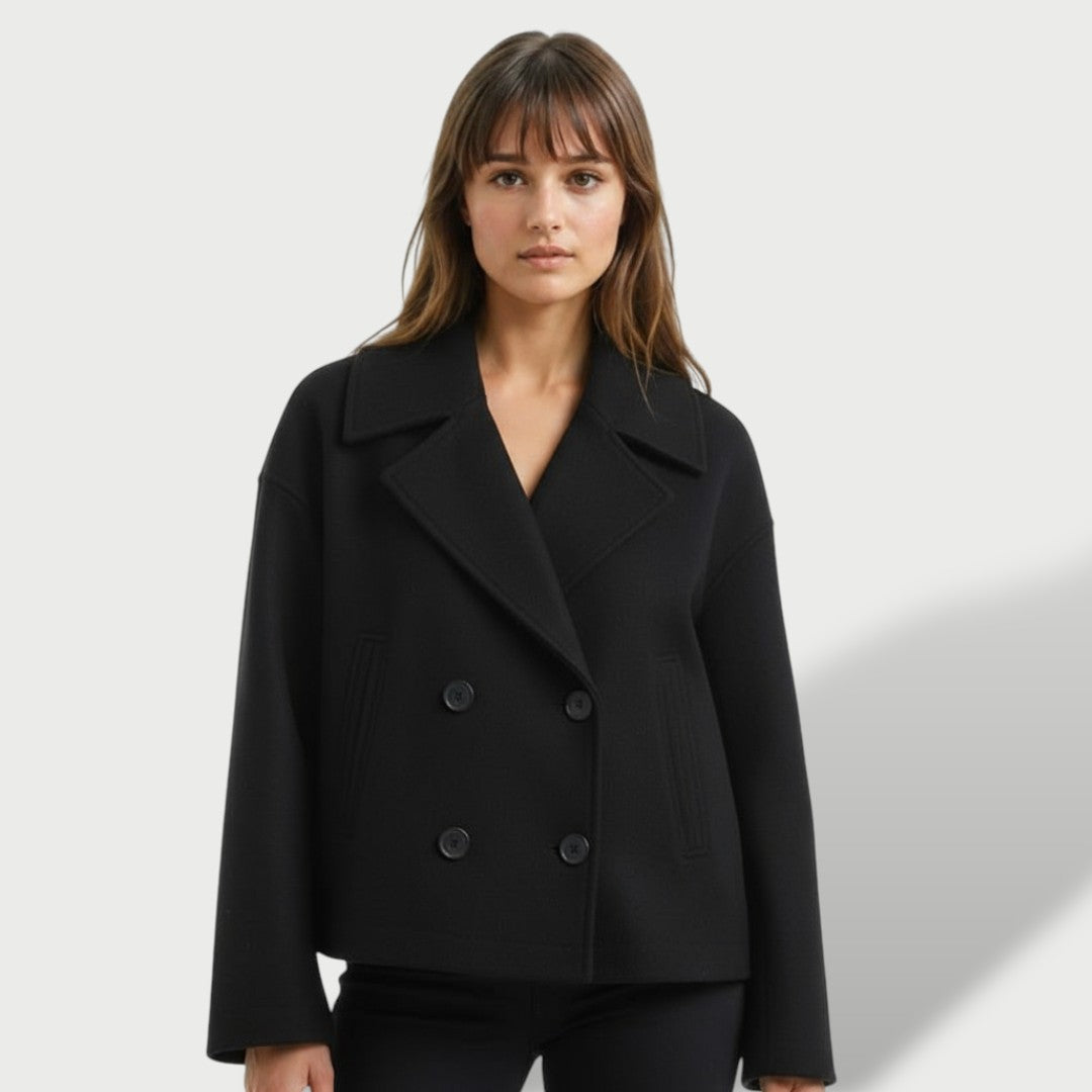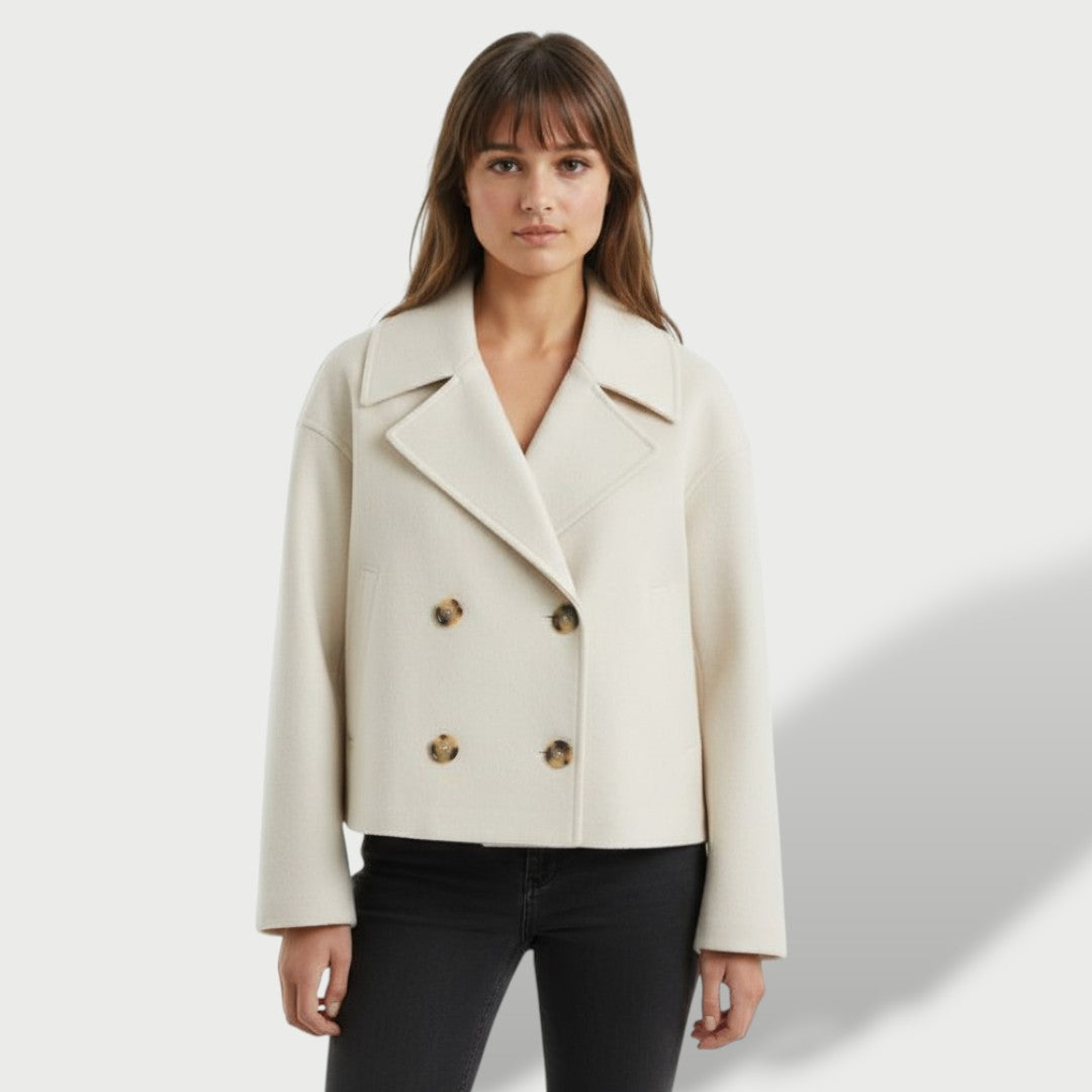 Ontdek de perfecte mix van elegantie en comfort met deze korte, dubbelrijige damesjas. Ideaal voor zowel casual als chique outfits, deze jas voegt direct een stijlvolle touch toe aan je look.