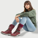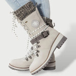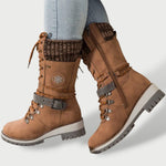 Deze winter dames sneeuwlaarzen combineren stijl en functionaliteit met een cozy brei‑manchet, stevige vetersluiting en decoratieve gesp. De anti‑slip zool zorgt voor grip op ijs en sneeuw, perfect voor winterse avonturen of dagelijks gebruik.